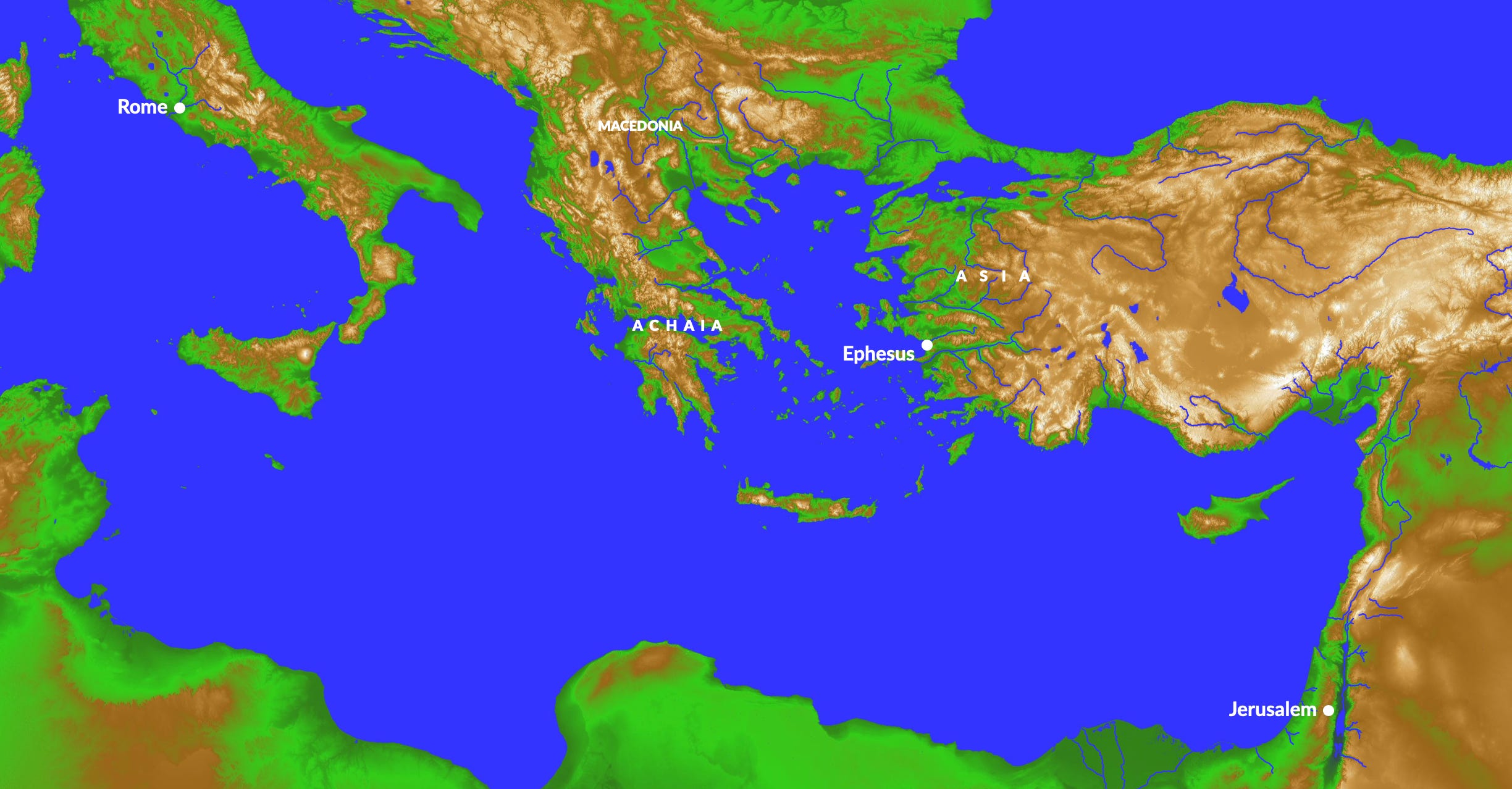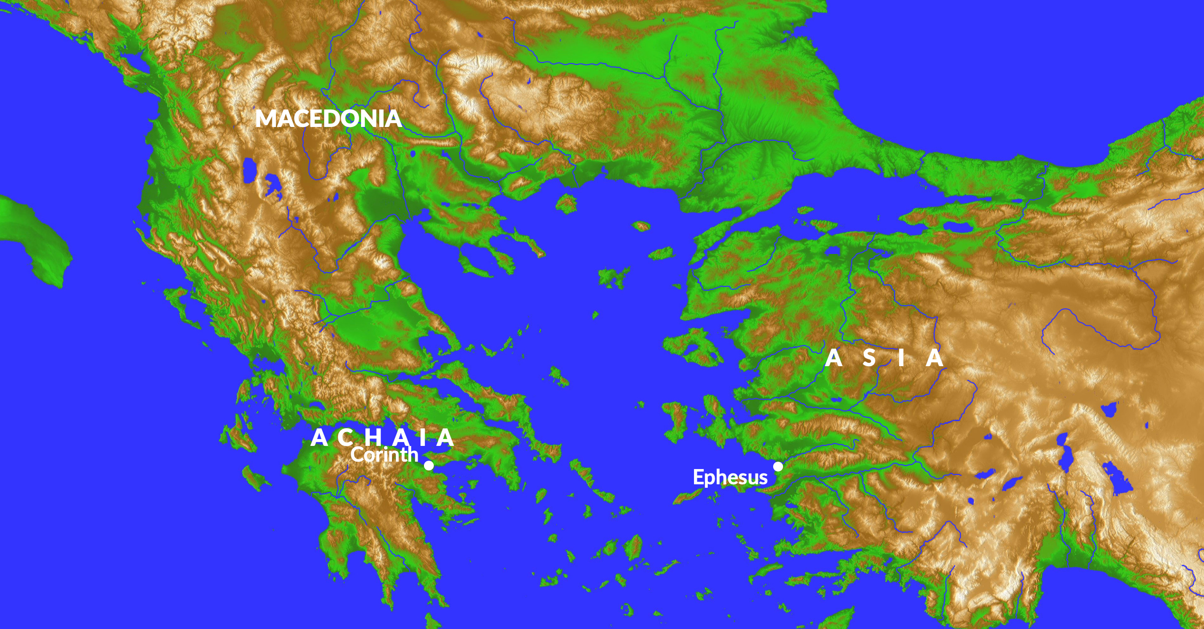 Ephesus is in the western part of Asia, across the sea from Achaia.