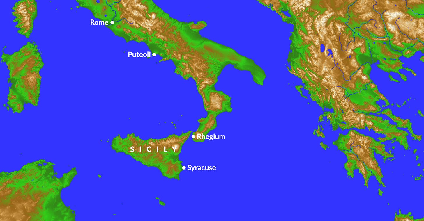 It was about 75 miles / 120 km from Syracuse to Rhegium. Then it was about 210 miles / 340 km from Rhegium to Puteoli.