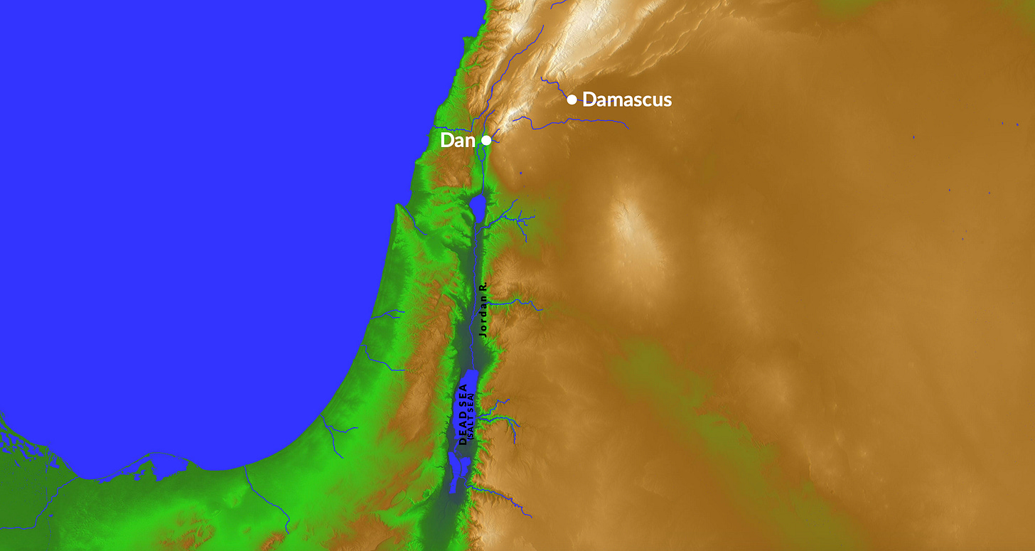 After defeating the Dead Sea Alliance, the Mesopotamian Alliance went north to go back to Mesopotamia. Abram and his men pursued them to Dan, which was north of the Sea of Galilee.