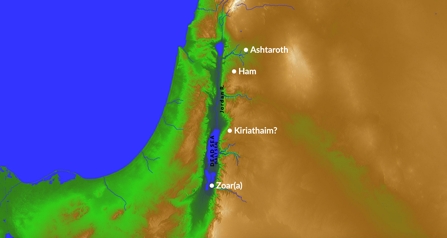 Gen. 14:5 So in the fourteenth year Chedorlaomer and the kings that were with him, came and struck the Rephaim in Ashteroth-karnaim and the Zuzim in Ham and the Emim in Shaveh-kiriathaim,