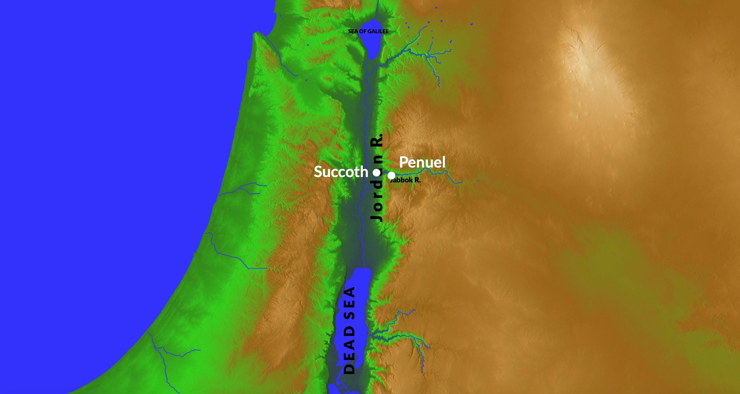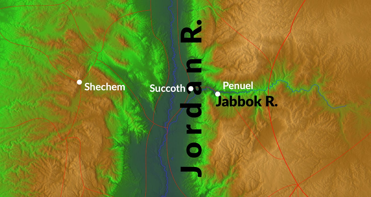 After Jacob and Esau separated, Jacob traveled west, down into the Jordan River valley to Succoth.
