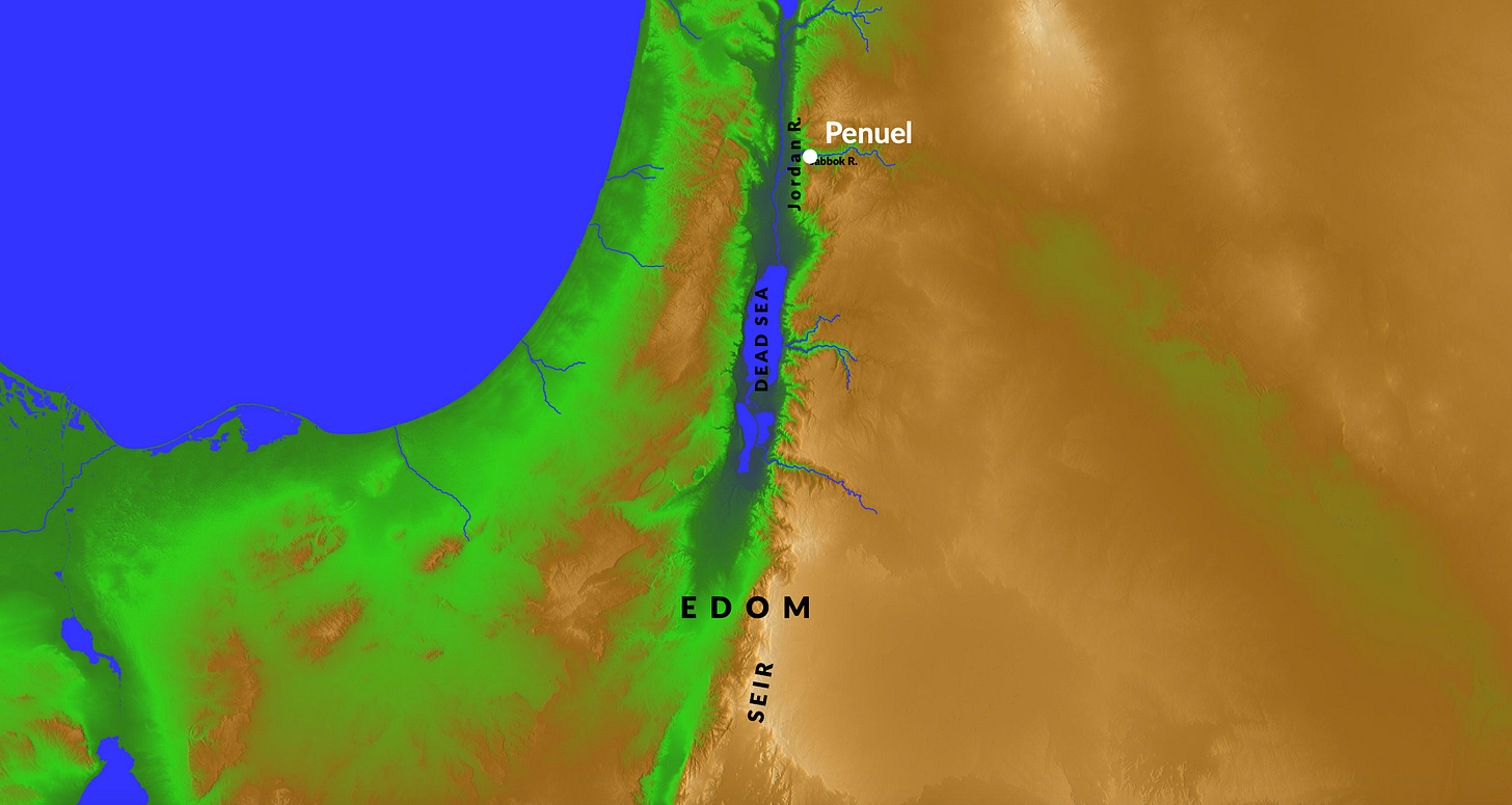 Esau lived in Seir. Seir was south of the Dead Sea. It is around 125 miles / 200 km from Penuel to Seir. That would be at least a 5 day journey.