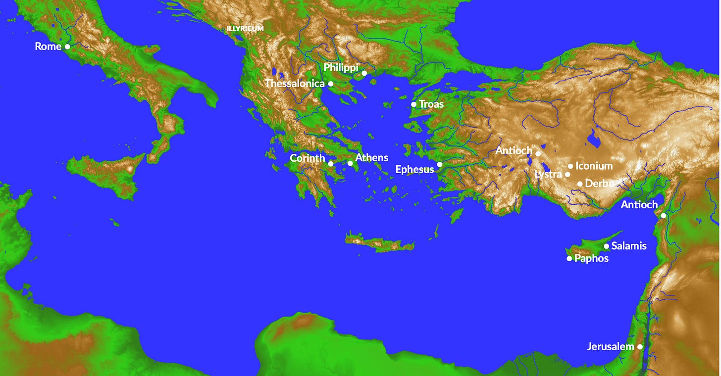 Illyricum is near the top left of this map. Jerusalem is in the lower right. Up to the time Paul wrote this letter, his area of ministry was between those two areas.